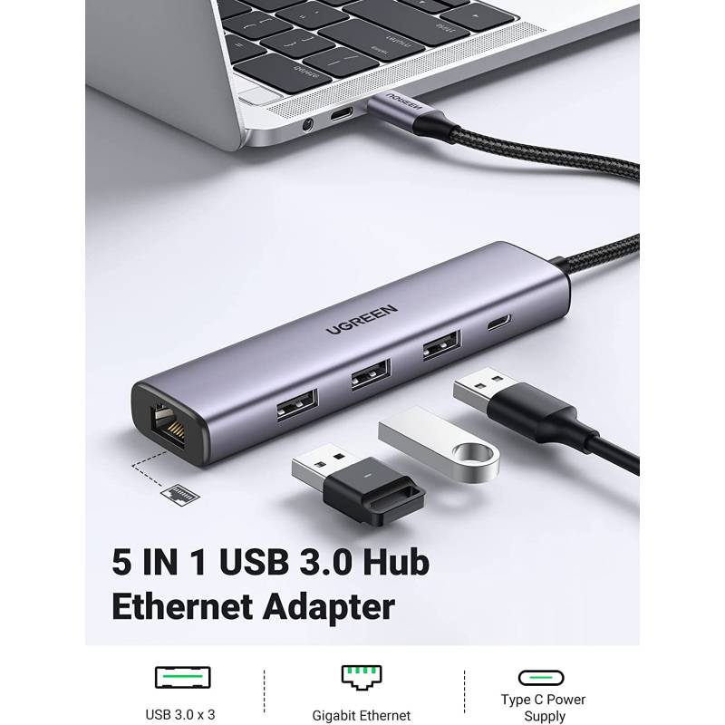 ADAPTADOR USB 3.0 5 EN 1 UGREEN 1 puerto de red gigabit , 3 puertos usb 3.0 , 1 puerto de 5v carga , compatible con windows, mac os, linux , plateado .